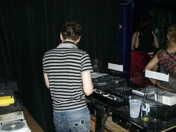 The man is in the back of a club working as a DJ.