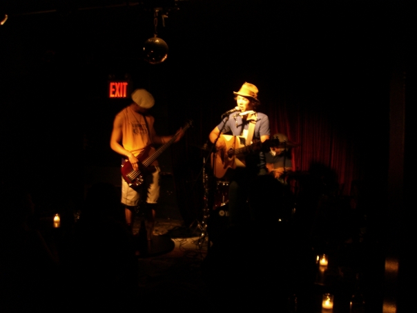 On a dimly lit stage with a red EXIT sign behind them, this cool duo plays some alternative rock tunes for the small crowd in the neighborhood club.