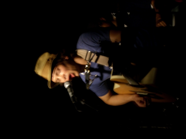 blurry, darkish photo of a guy in a blue shirt, cool hat. playing a guitar and singing into a microphone.