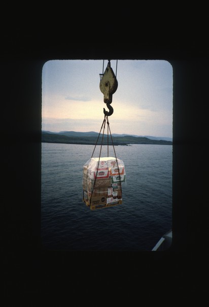 In this picture a Goods carrier is mooving a goods from one place to other ship on the sea. |