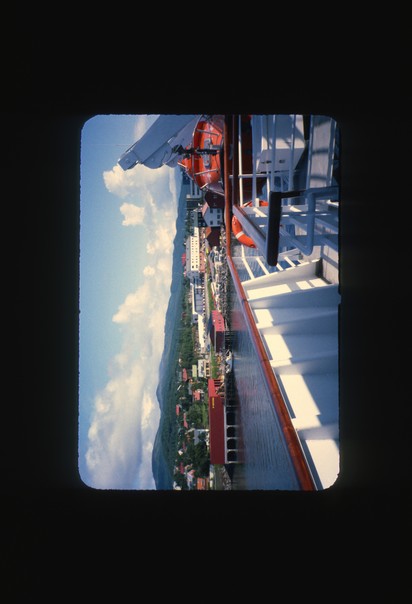 A photo taken from a boat overlooking a body of water on a sunny day with a forested town in the background. |