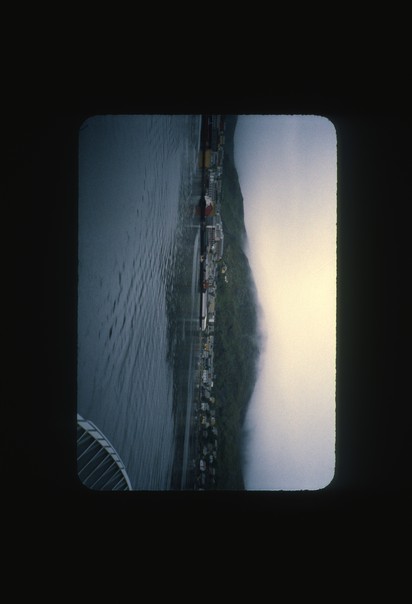 A sideway framed picture looking out a window at water and land.