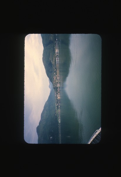 The reflection of the mountains and the village can be seen in the dark green water. |