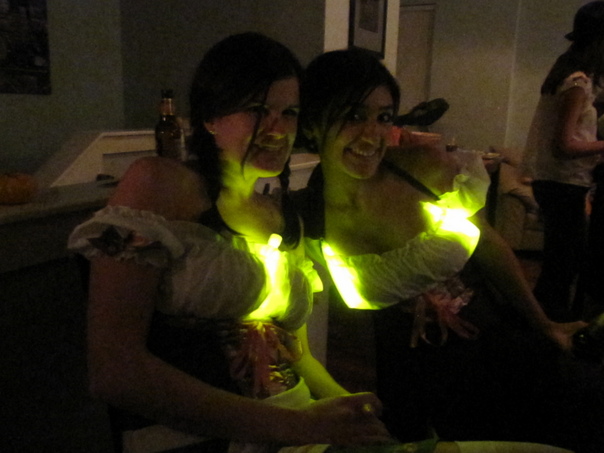 Two dark haired women are wearing white shirts with green glow sticks underneath.