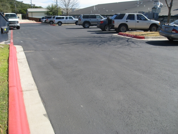 The large parking lot had a curb that was painted bright pink.