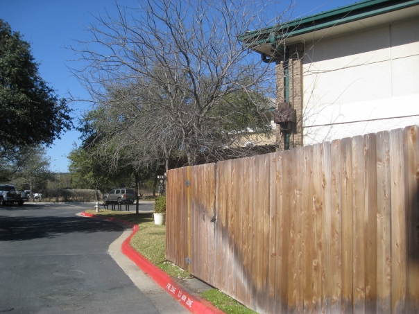 A small tree with no leaves pokes over a wooden fence near a street with a red curb.