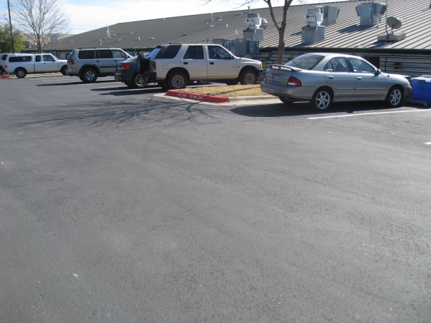 Cars parked in a flat parking lot with a red curb between them and metal roofed structure in front.