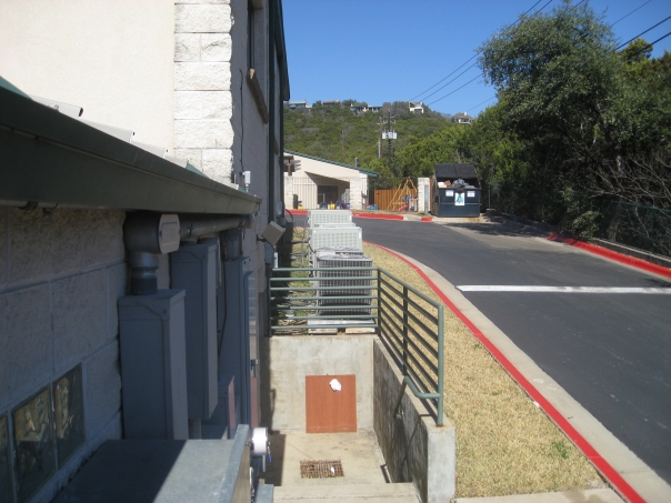 back side of a building, driveway with a speed bump, trash bin