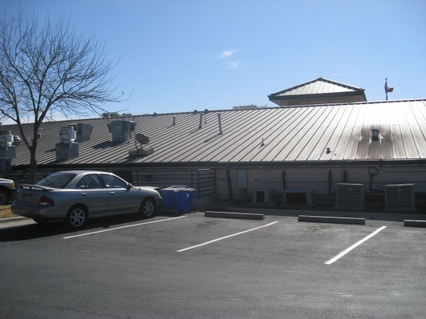 car parking lot building metal roof flag tree