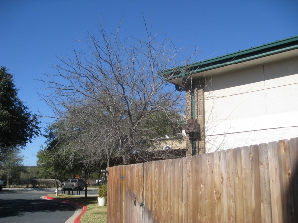a home with a solid fence and dead tree
