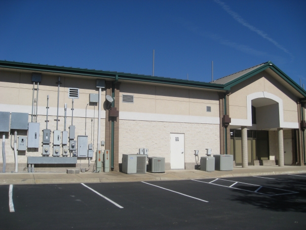 A nondescript building with a lot of mechanical boxes faces a parking lot on a clear day