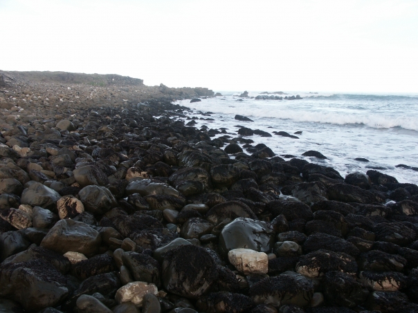 the photo is of sea side from the shpore wher lots of stone are laying.