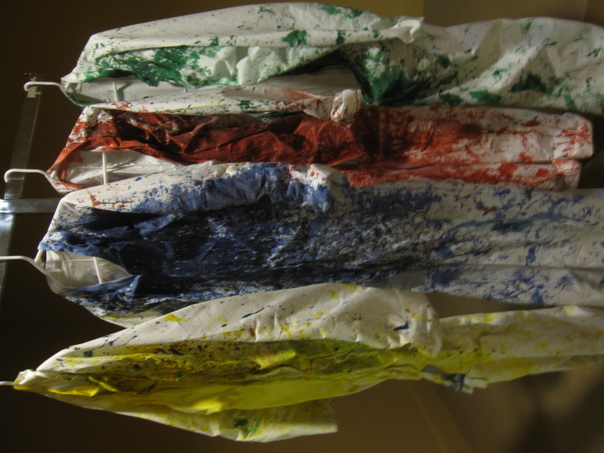 The four jump suits are yellow, blue, red, and green.
