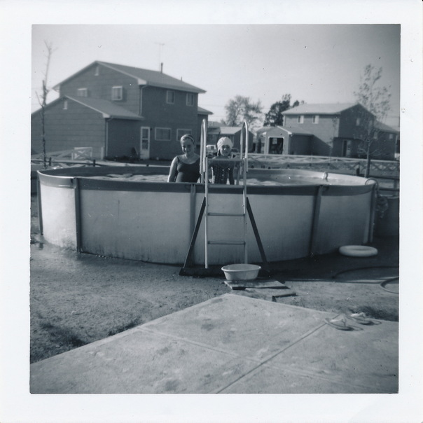 Of two little girls in a swimming pool during the day that has a really big house in the background.