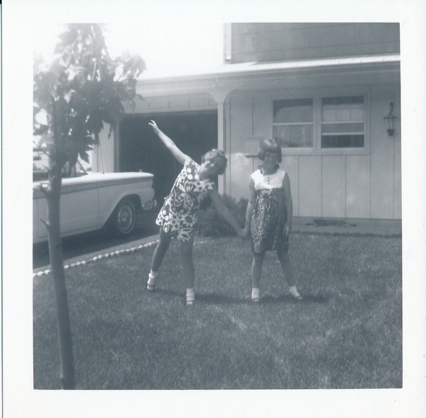 Retro picture of two girls holding hand in a lawn in front of house