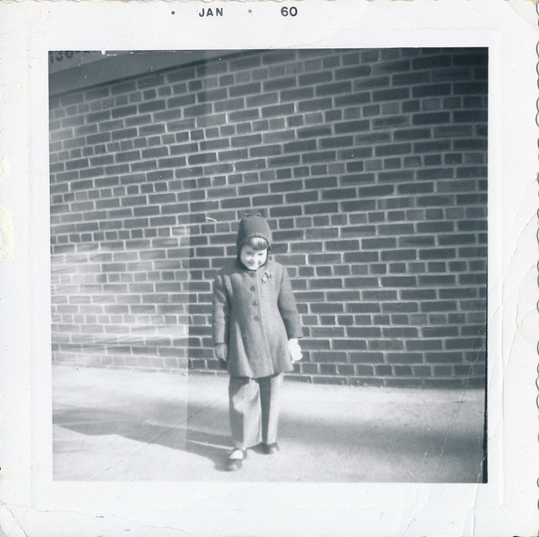 A happy, smiling little girl looks down shyly at the pavement while standing outside a brick building. She's dressed warmly in trousers, button up coat, gloves, knit cap, and Mary Jane shoes.