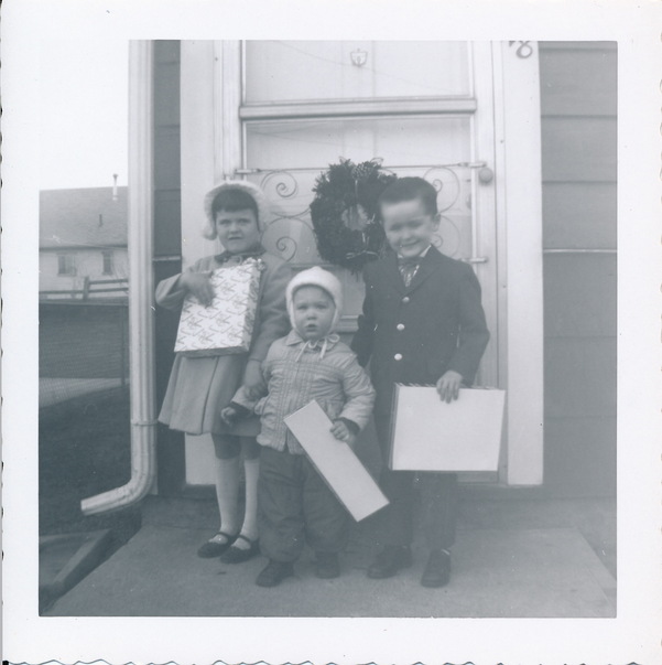 A black and white photo of three children holding Christmas presents, taken in the past.