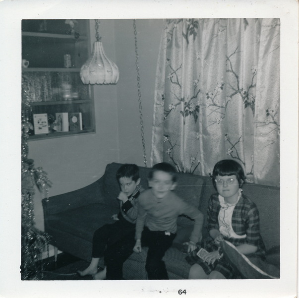 In a black and white photo from the 1950s-1960s, two small boys and a small girl in glasses, pose on the sofa near a Christmas tree.