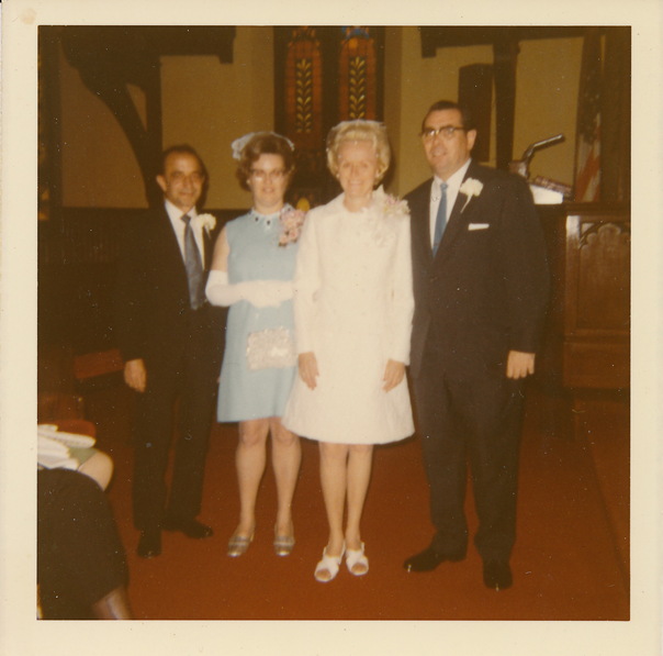 Two older couples standing next to each other and dressed formally while smiling inside a church.