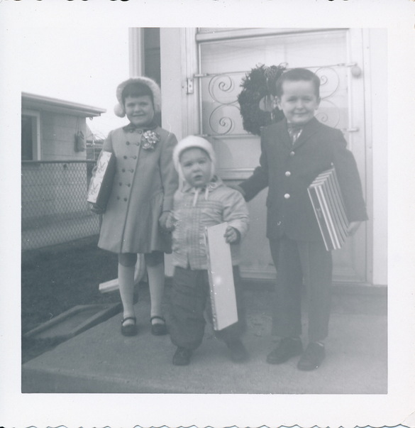 vintage photo of three children holding presents