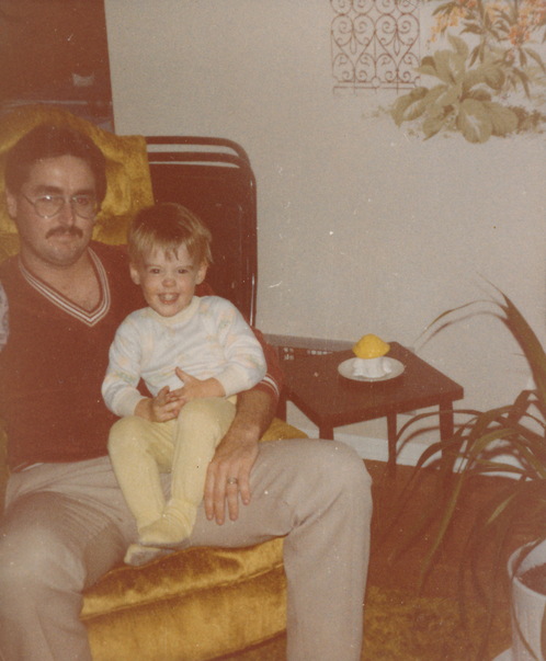 In a sepia tinted photo from the 70s or 80s, a mustached man in his 30s sits with a small blond boy in pyjamas on his lap.