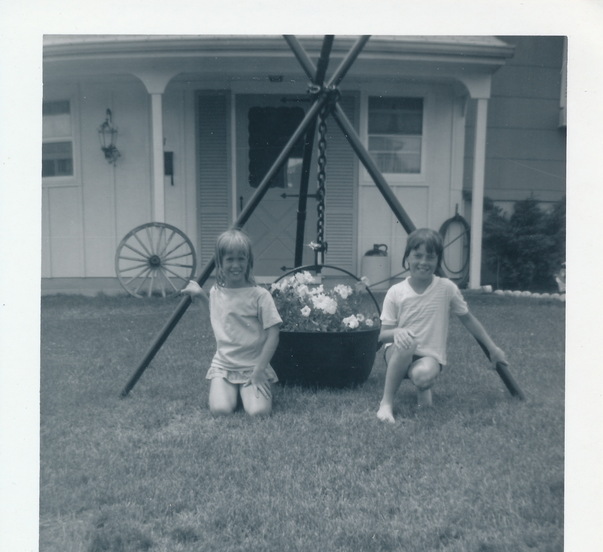 The children pose by the cast iron cauldron on a tripod in the yard, now filled with flowers.