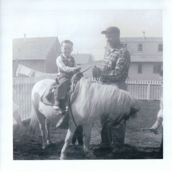 A man wearing a checked shirt steadies a shaggy pony being ridden by a boy wearing a cowboy's vest.