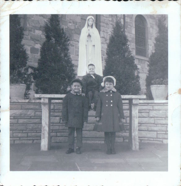 Three children in dark coats are posed in front of a white statue.