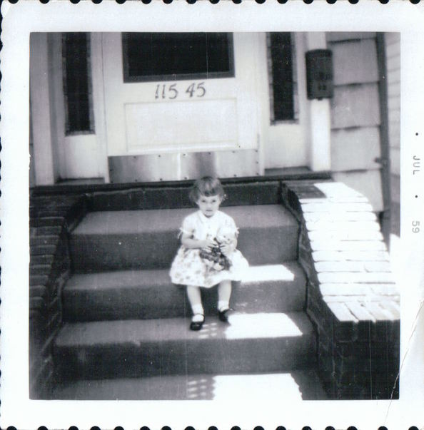 A young girl in a dress sits on the middle stair of the stairs leading to the front door of a house with the number 11545 marked in metal numerals on the bottom of the door.