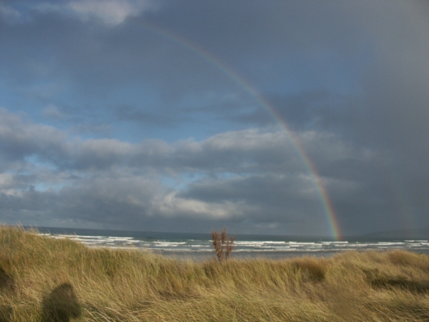 a beautiful rainbow appears in front of clouds above a beach with dunes covered in tall grasses