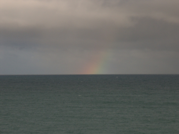 a view of the sea and a rainbow in the distance all under a cloudy sky