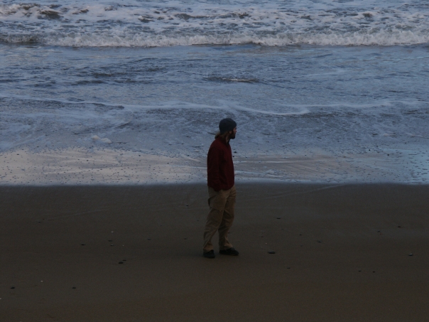 A man in a red shirt and khaki pants stands on a sandy beach.