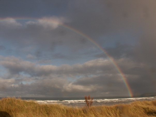 A rainbow arching into the sky appearing over a field with rain clouds passing off into the distance