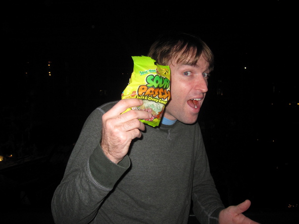 A male stands holding a packet of sour candy while looking towards the camera eagerly.