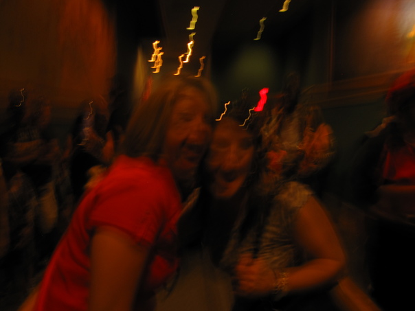 A very blurry picture of two women dancing and having fun at a party.