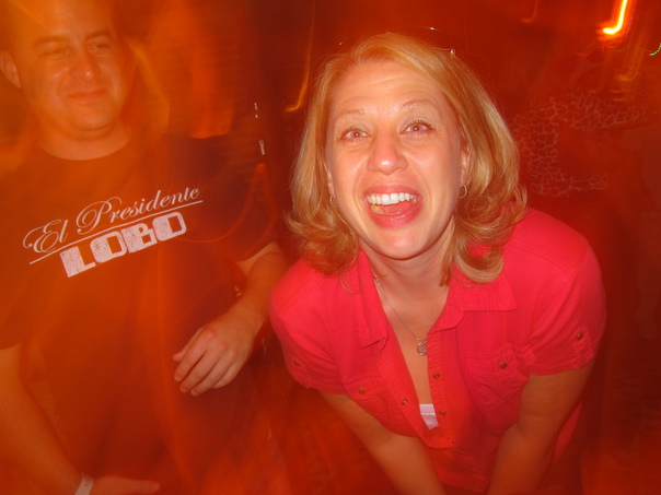 The blond in the red blouse was very excited to hear that her team won.