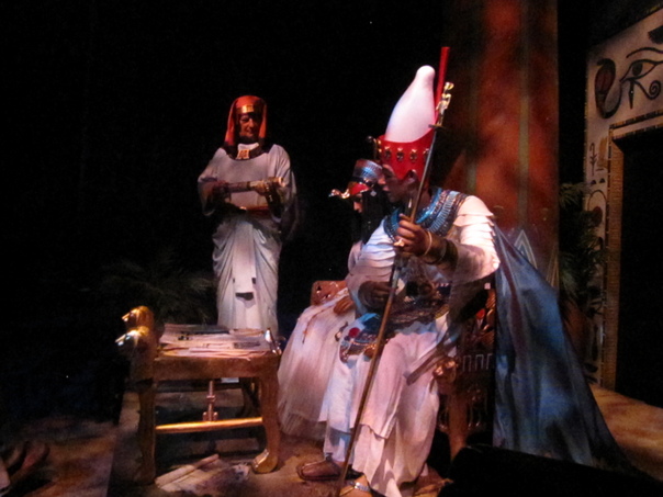Three people dressed like egyptians and a table is in front of them..