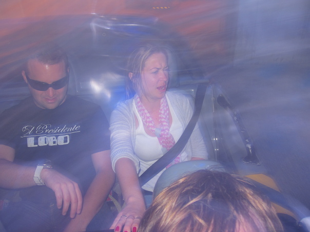lady looks discomfortable riding in a amusement ride