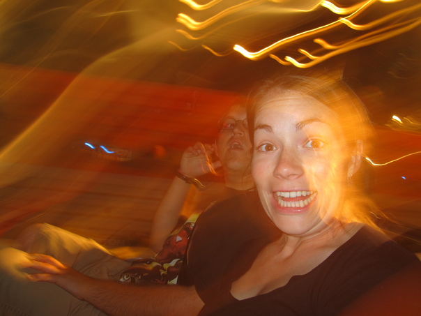 Friends taking a ride, reacting to the increased speed of the vehicle.