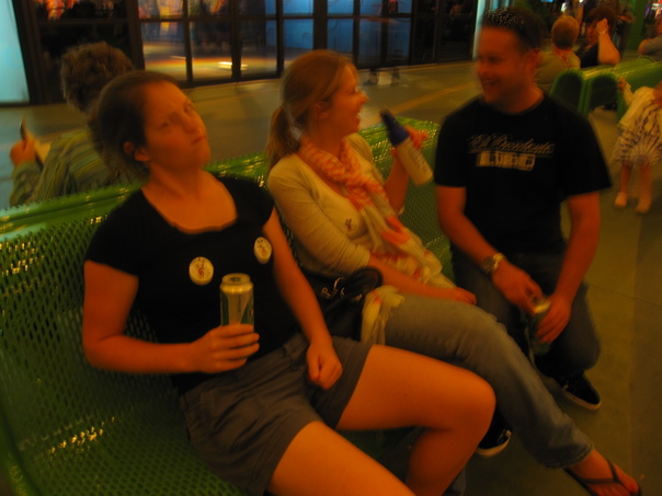 The friends are sitting on a green bench drinking beer and talking to each other.