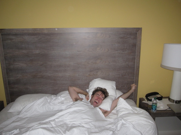 the young man is woke up from his bed ,he is too enthusiastic and going to start his day.