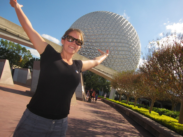 A pretty woman with out-stretched arms having a great day posing in front of Disney's Epcot Spaceship Earth ride (Geodesic dome) in Orlando, Florida.