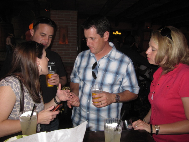 Four individuals, drinking beers and chatting in a circle on the inside of a bar.