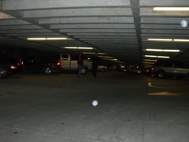 Two girls are standing in front of a beige, extended cab pick-up truck in a parking garage. They are facing the camera, and there are two white balls of light that are floating in front of them. The lights are on overhead, and many of the cars in the garage have their parking lights on as well.