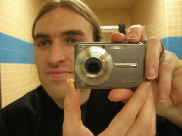 A long haired middle aged white male holds up a camera and take his own photo in a mirror