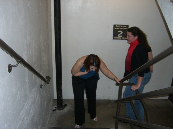 Two young women pause to catch their breath during an exhausting stair climb to the rooftop.