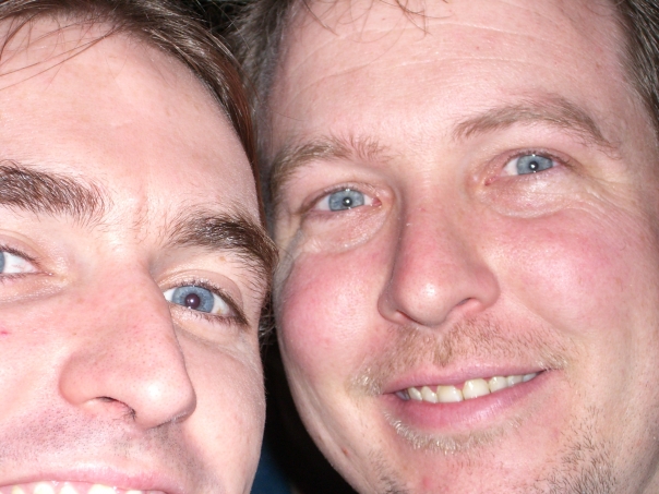 Picture of two goof-balls. Possibly brothers as they have the same eye color and noses.
