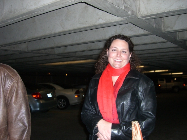 A woman with a black leather jacket is seen smiling while wearing a red scarf in a parking structure.