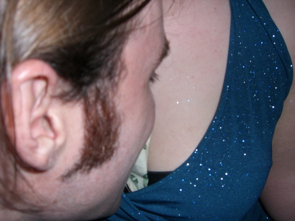 A guy getting very personal with a girl and a 20 dollar bill.