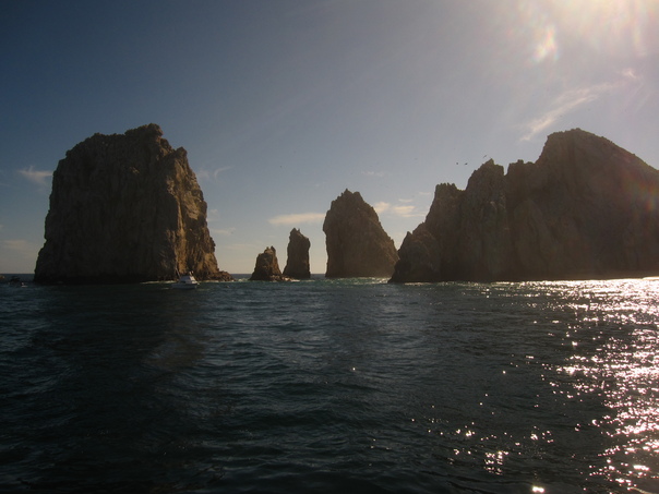 Beautiful, craggy rocks are seen jutting up from the vast ocean and the sun is reflecting upon the water.